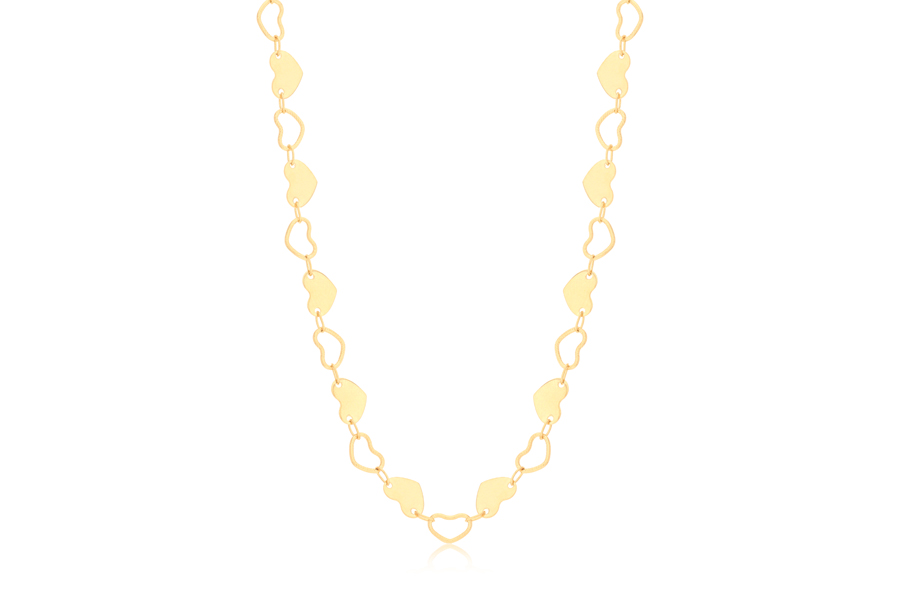 GARGANTILHA BANHADA EM OURO, ELO 1,20mm LARGURA, 40cm COMPRIMENTO, EXTENSOR 10cm COMPRIMENTO E CORAÇÃO 7mm LARGURA, PARA QUALQUER COR